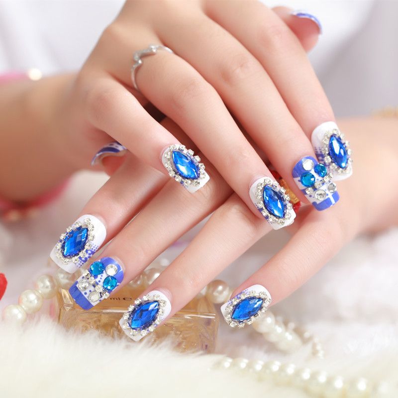 Hot Sale Wedding Nails White And Royal Blue Long Square With Blue